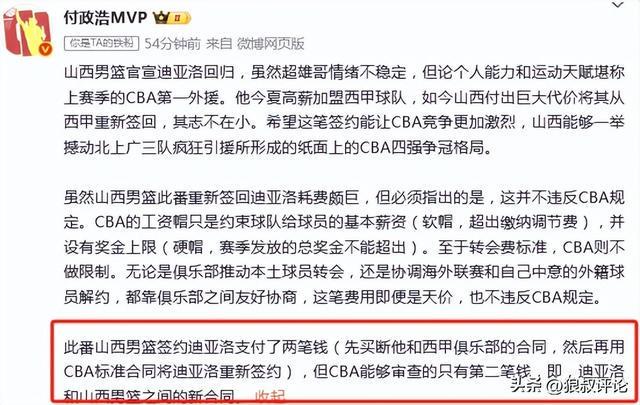 媒体人:山西重签迪亚洛支付了两笔钱CBA能够审查的仅是第二笔钱