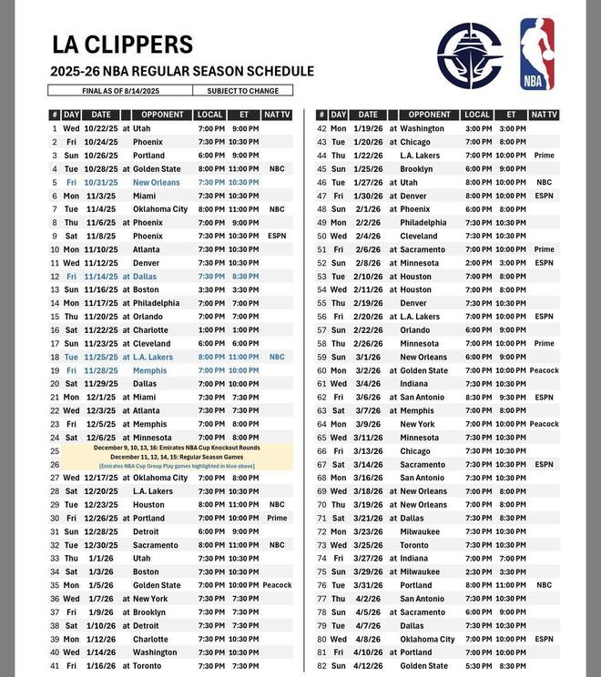 雷速体育8月15日讯 今日NBA官方正式公布了联盟各队新赛季的全部赛程,洛杉矶快船队新赛季将迎来21场全美直播,排在联盟第12,背靠背次数15次,不再是联盟最多,但是明年3月份他们将