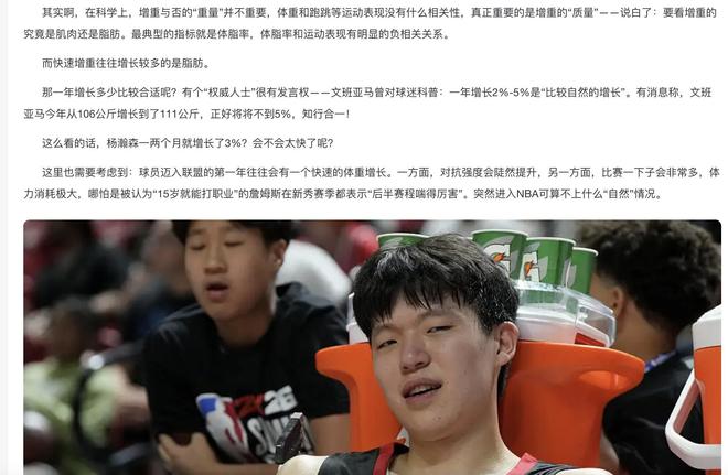 在NBA官方发布的这篇长文当中,他们也明确表示像杨瀚森在短短两个月之内增长八斤,相当于整个体重的3%,实际上确实存在着一定的风险。因为之前文班亚马接受采访的时候曾经透露过一个数据,他认为一个球员全年增肌2%到3%是比较健康的范围。所以杨瀚森在短短的时间之内增肌这么多,大家自然就担心他会有受伤的风险。