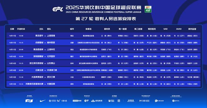 北京时间10月17日,中国足协官方公布了中超联赛第27轮裁判选派表。